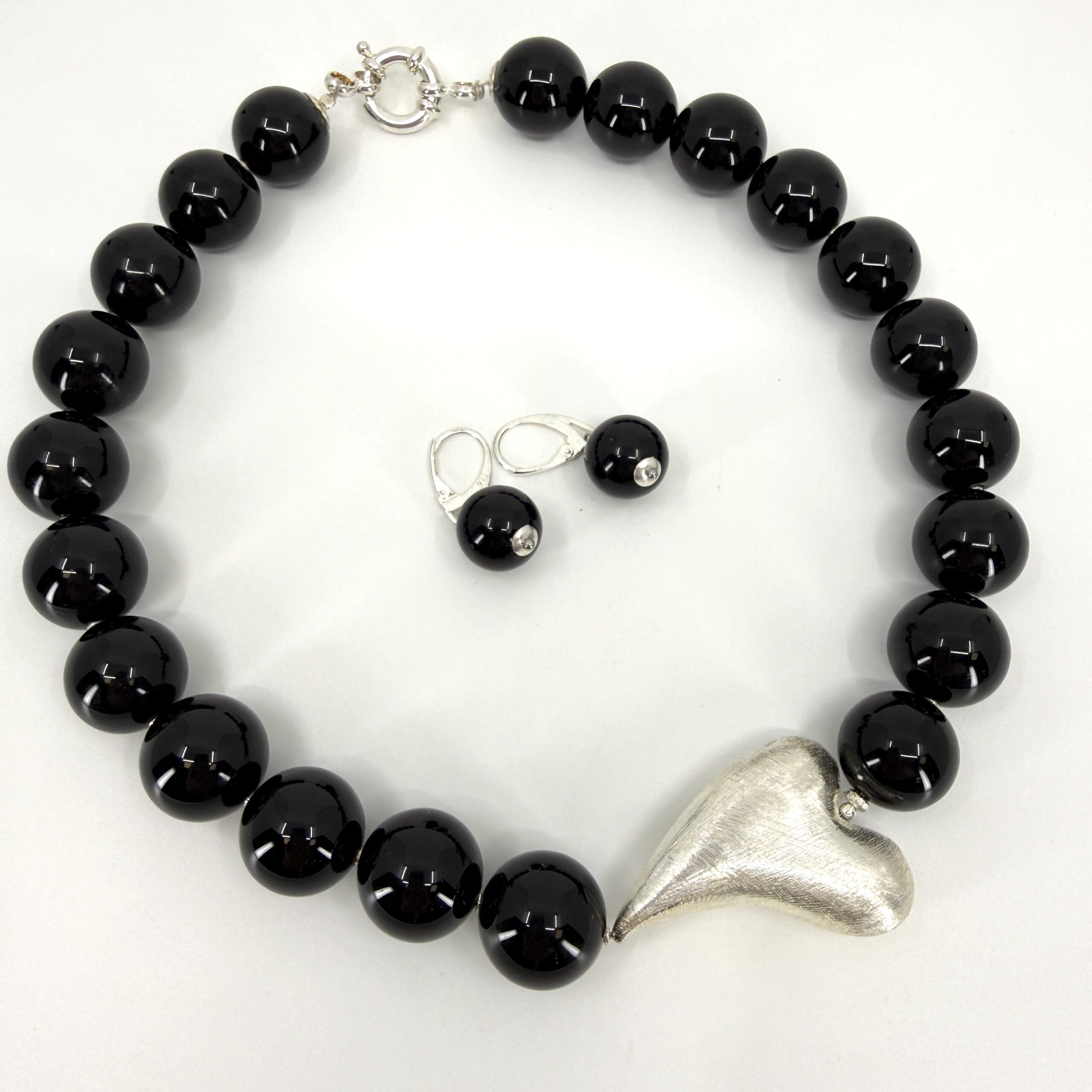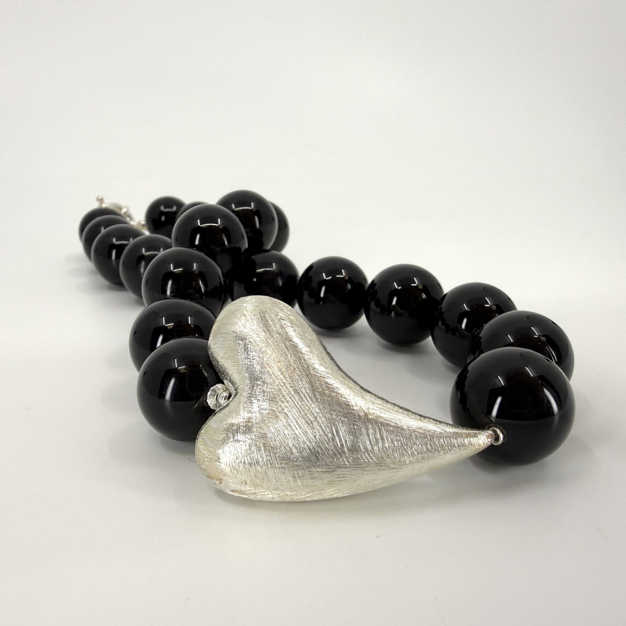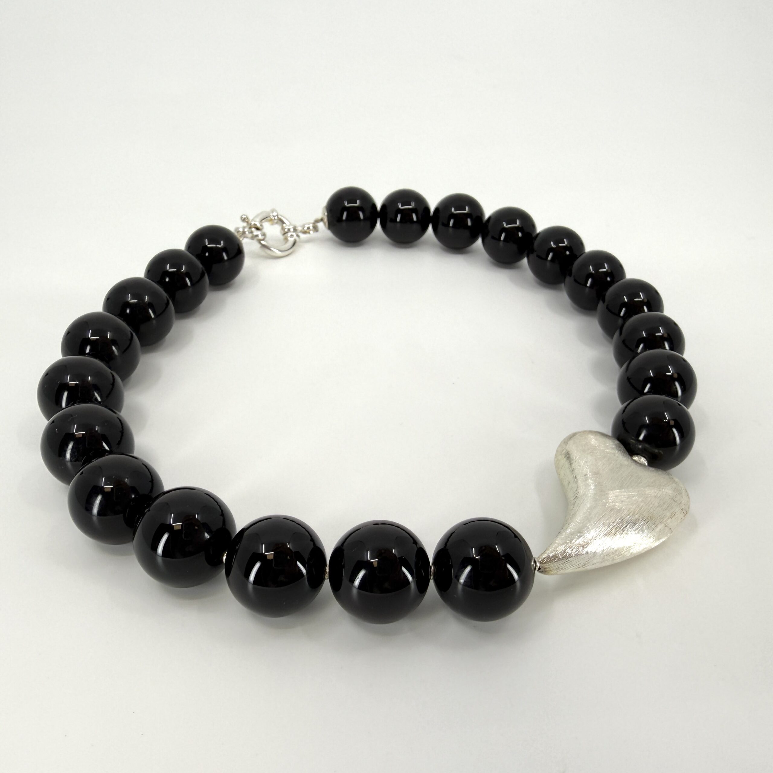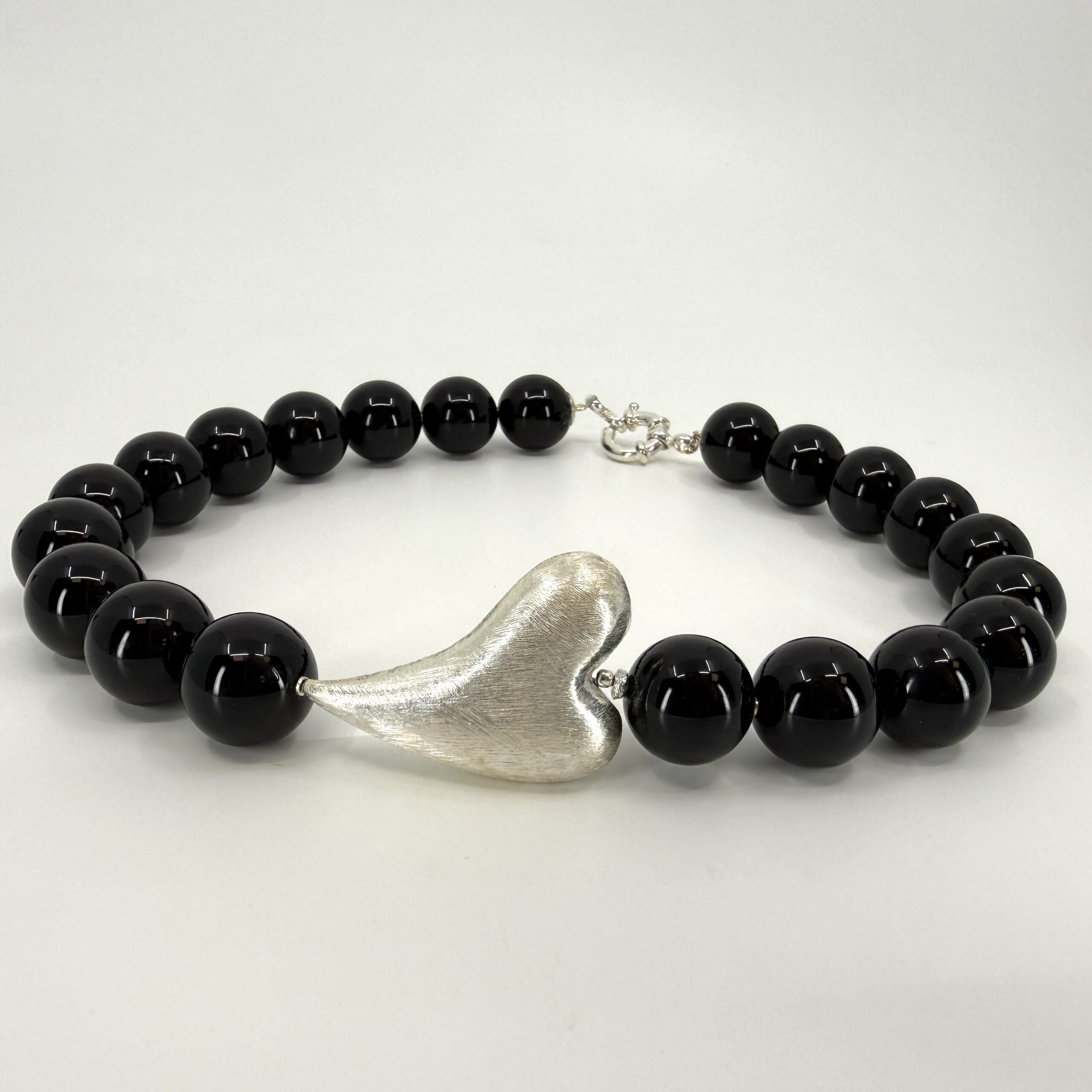 Ručne vytvorený náhrdelník z prírodného onyxu dopĺňa výrazné strieborné srdce, ktoré tvorí dominantný prvok celého šperku. Onyx dodáva náhrdelníku luxusný a elegantný charakter, zatiaľ čo srdce prináša jemný, ženský a symbolický detail.