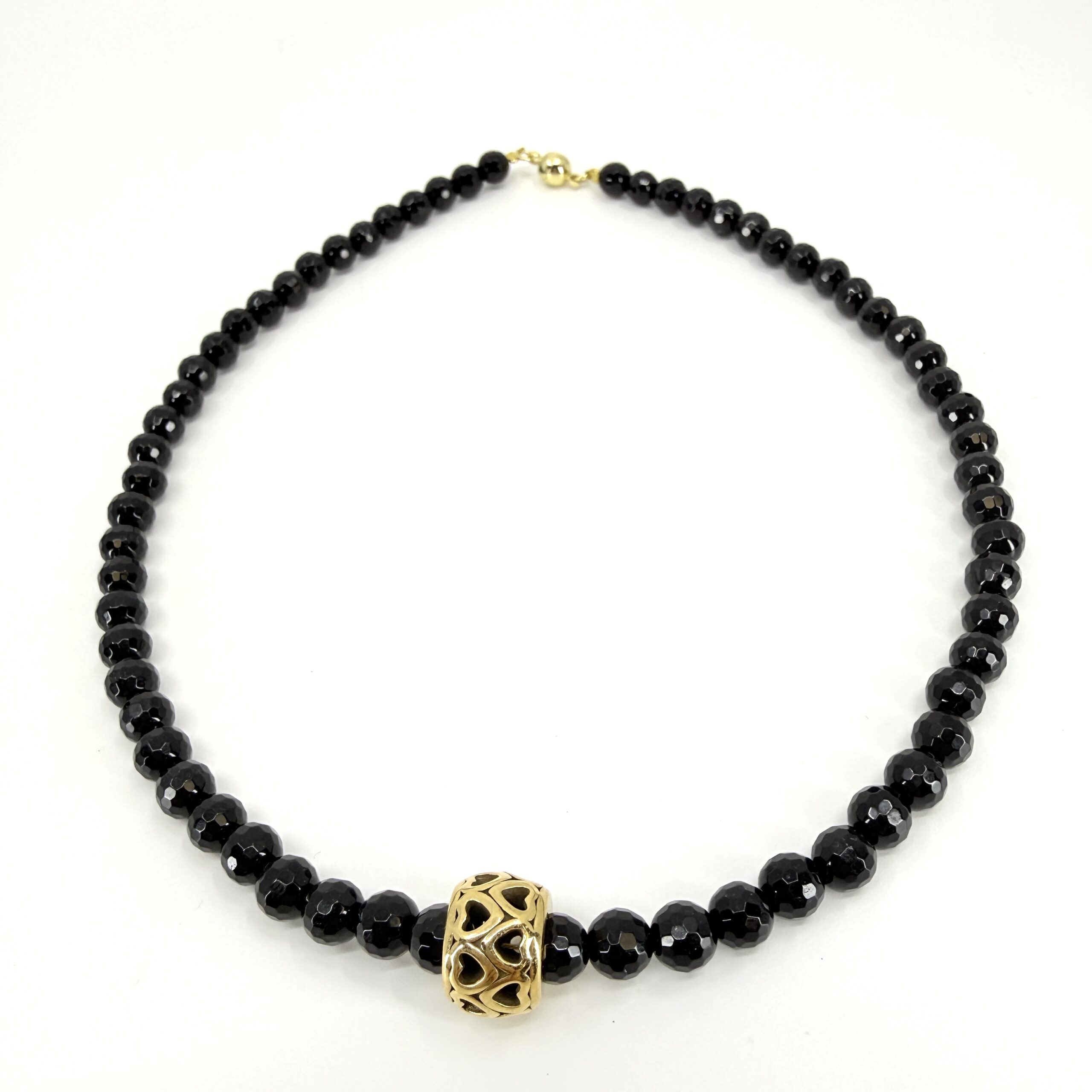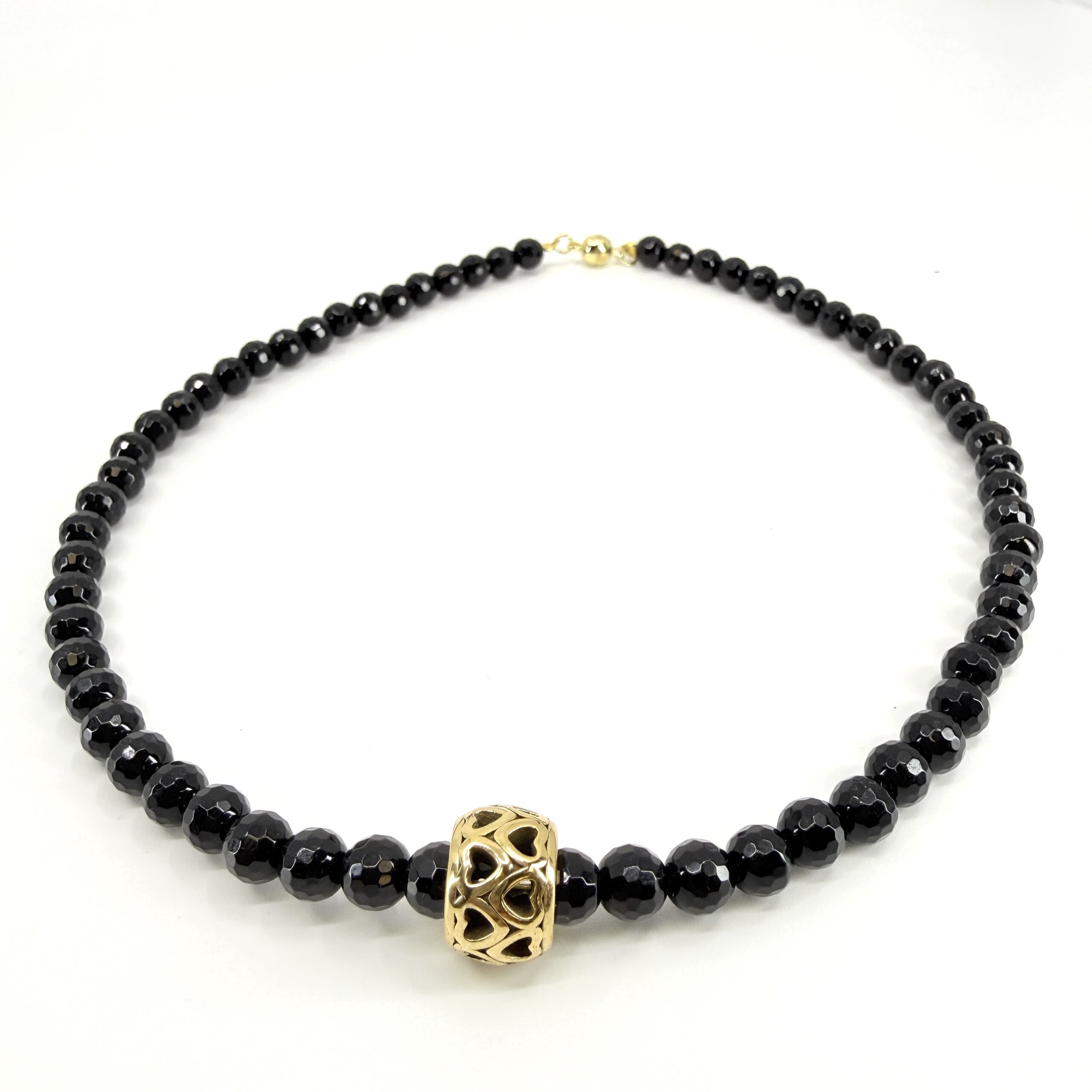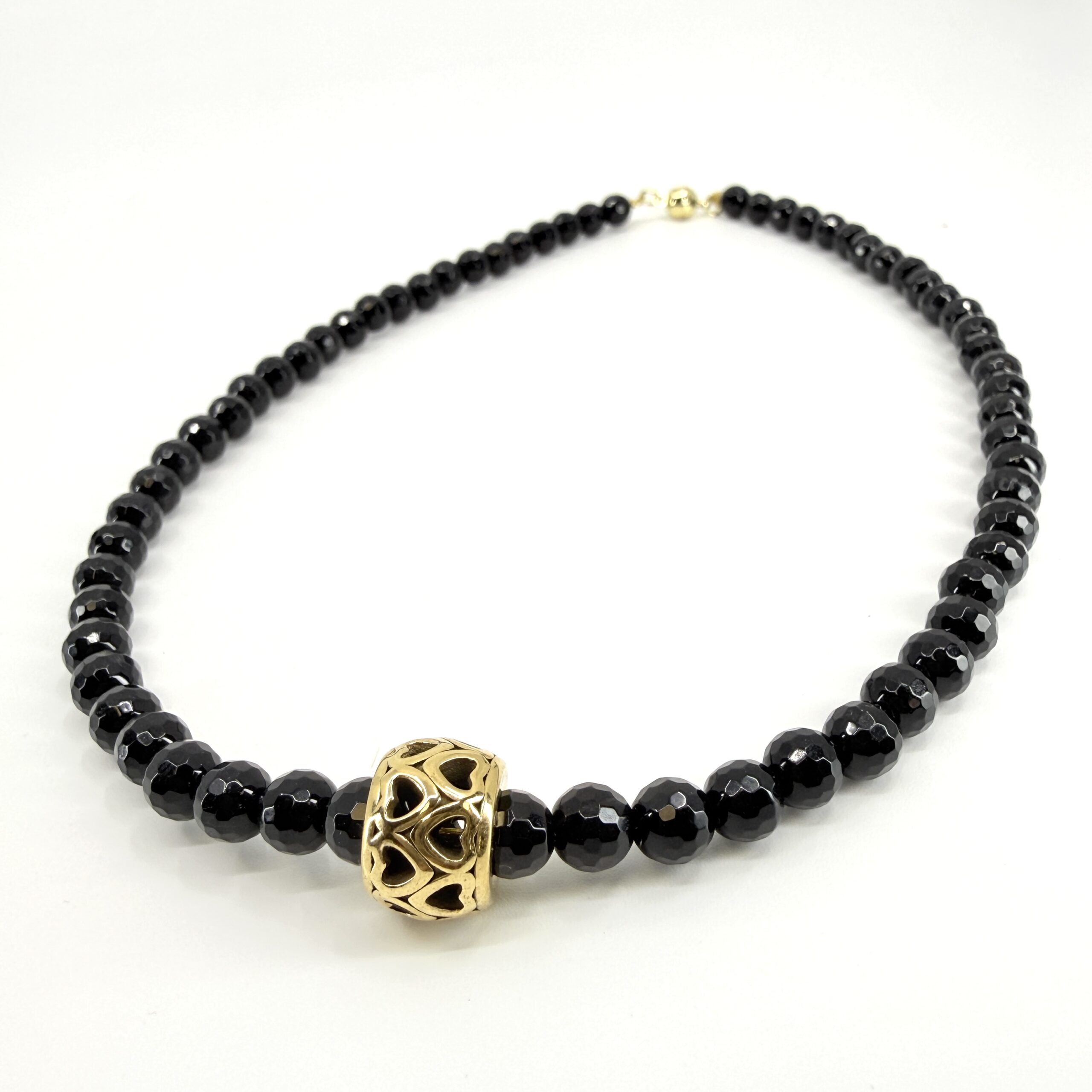 Onyx je kameň symbolizujúci ochranu, stabilitu a vnútornú silu. V spojení s detailom ukrytých srdiečok získava náhrdelník jemný romantický nádych – ideálny ako darček z lásky, výročný dar alebo osobný talizman.