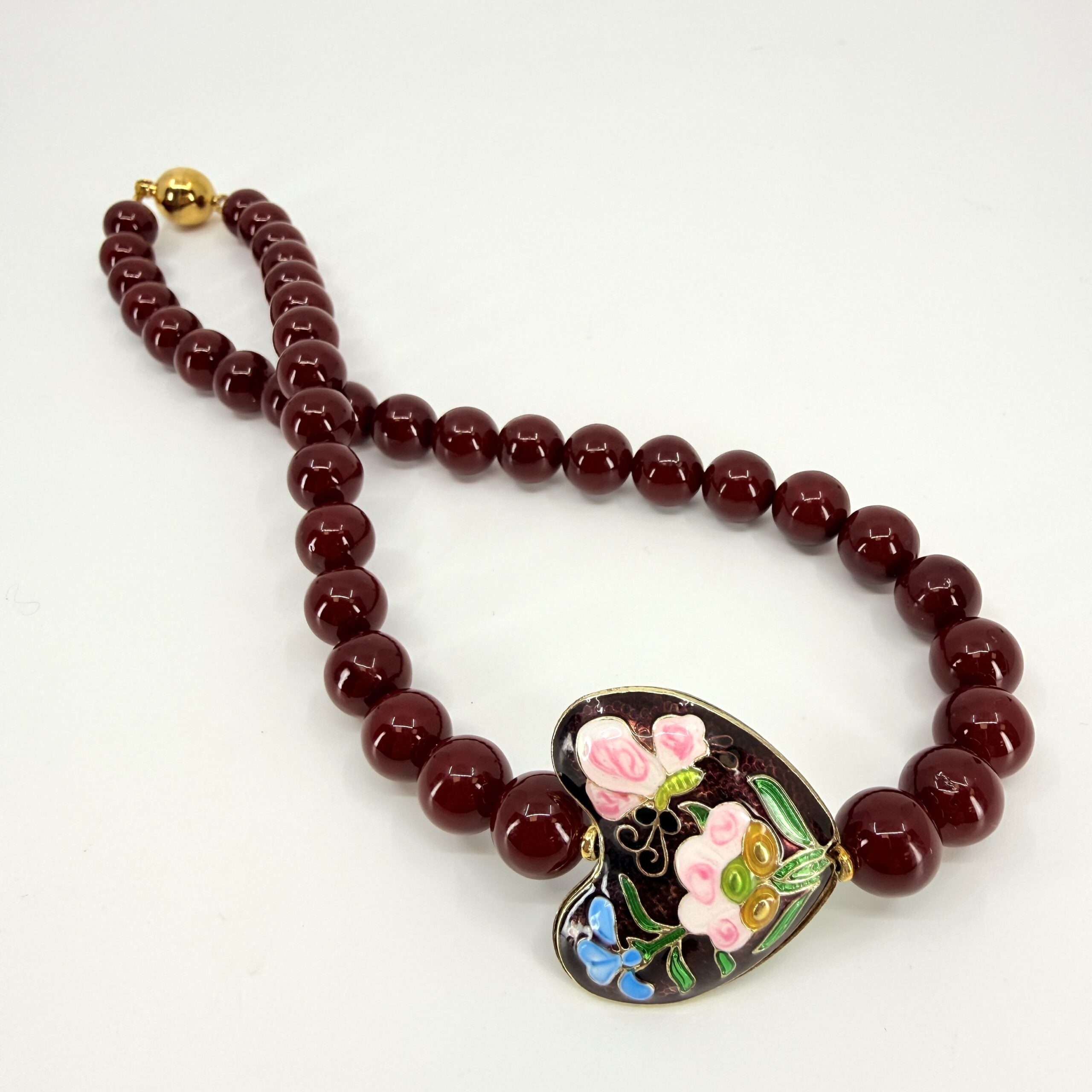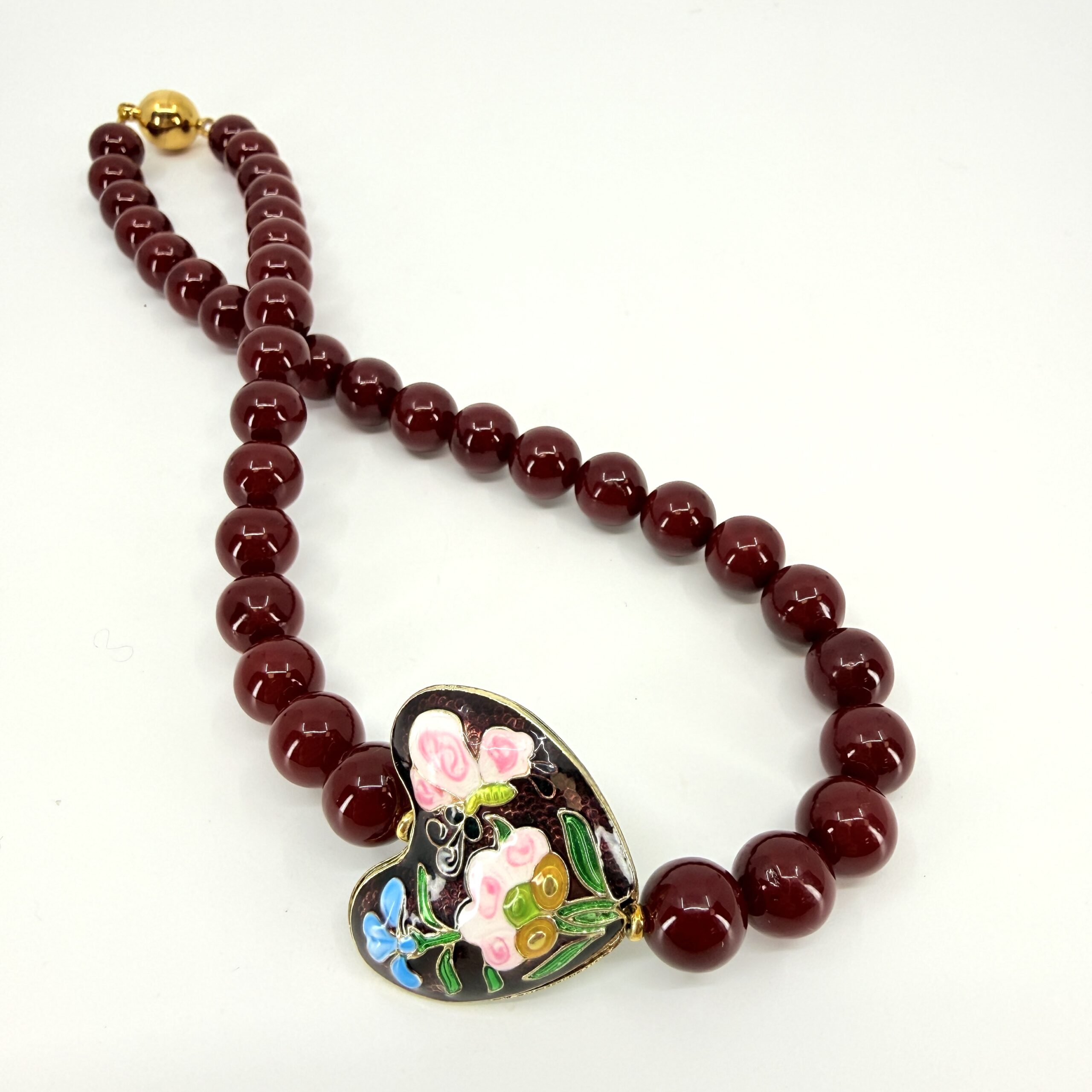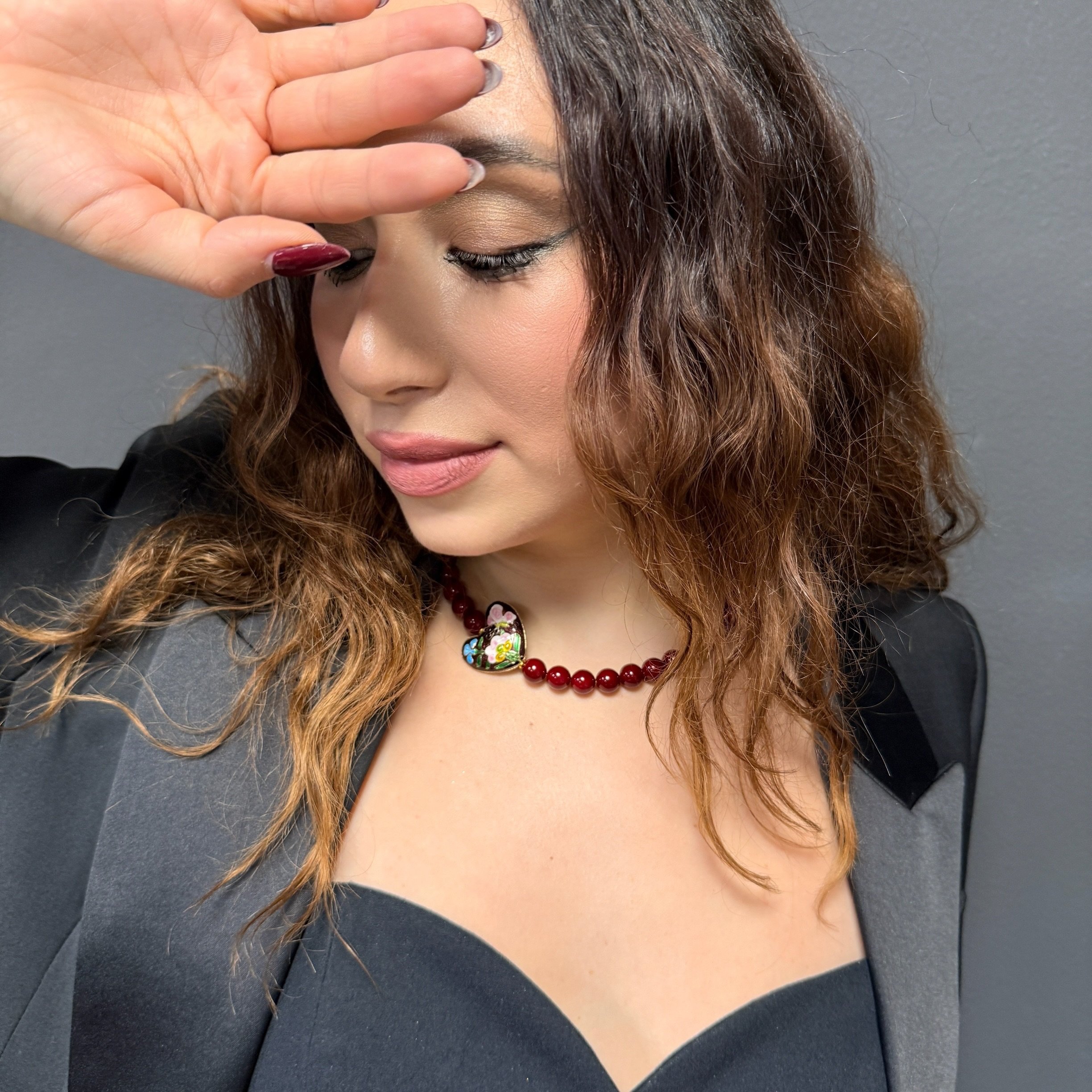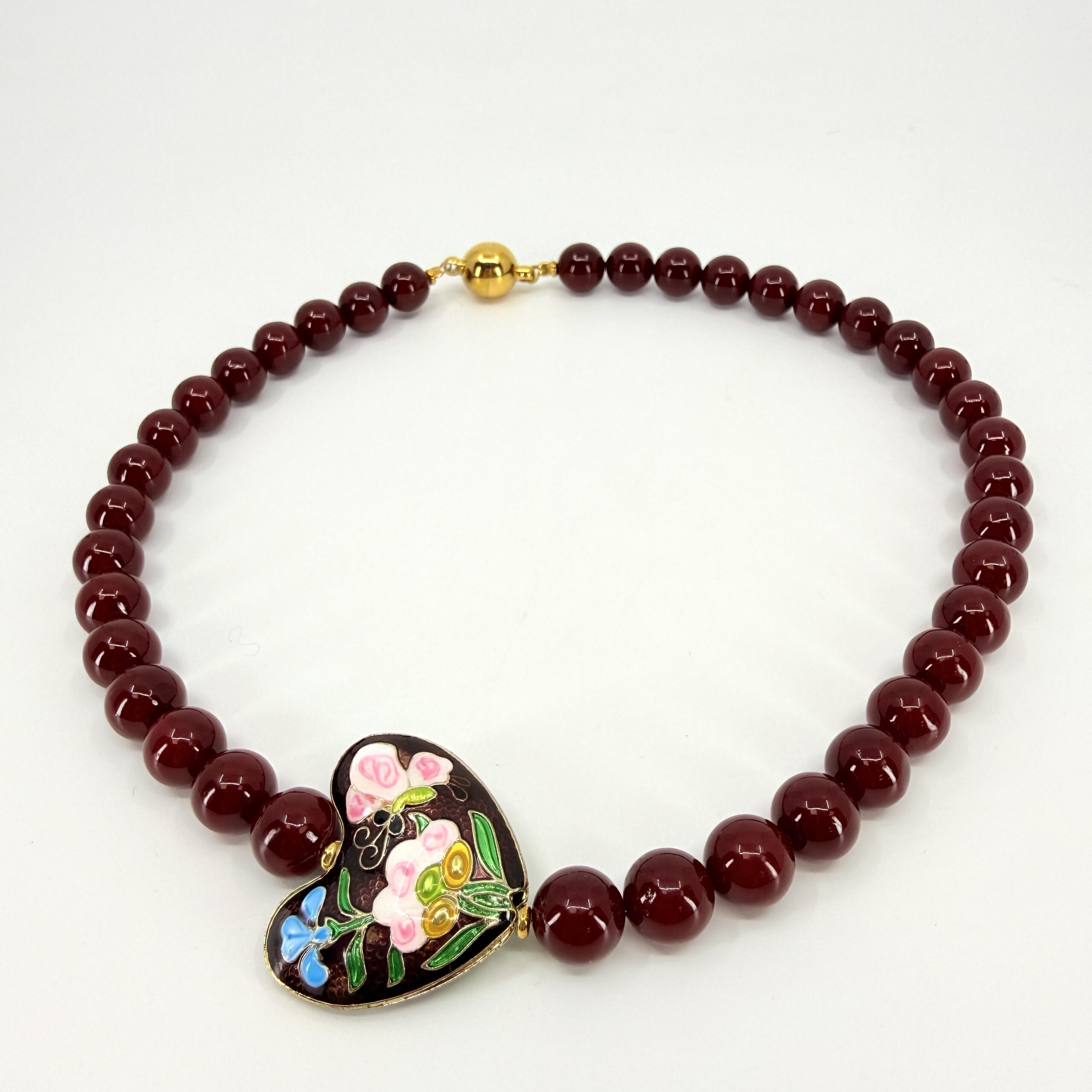 Shell perly sa vyznačujú vysokým leskom, hladkým povrchom a jednotnou farbou. Odtieň burgundy pôsobí luxusne, žensky a výnimočne – perfektne doplní čierne, béžové aj smotanové outfity. Dominantné srdce s ornamentovým emailom dodáva šperku umelecký charakter a robí z neho výrazný, no stále vkusný doplnok.