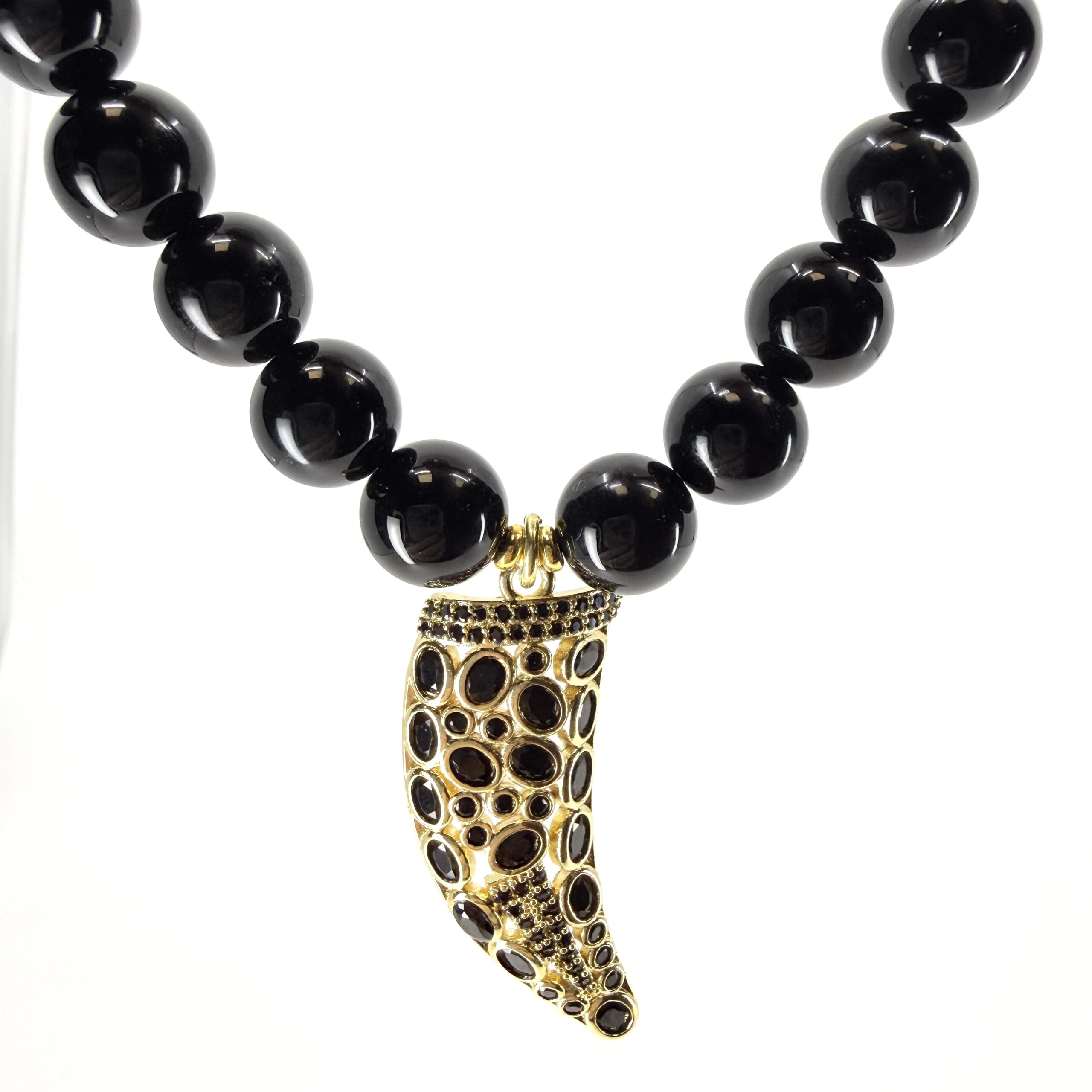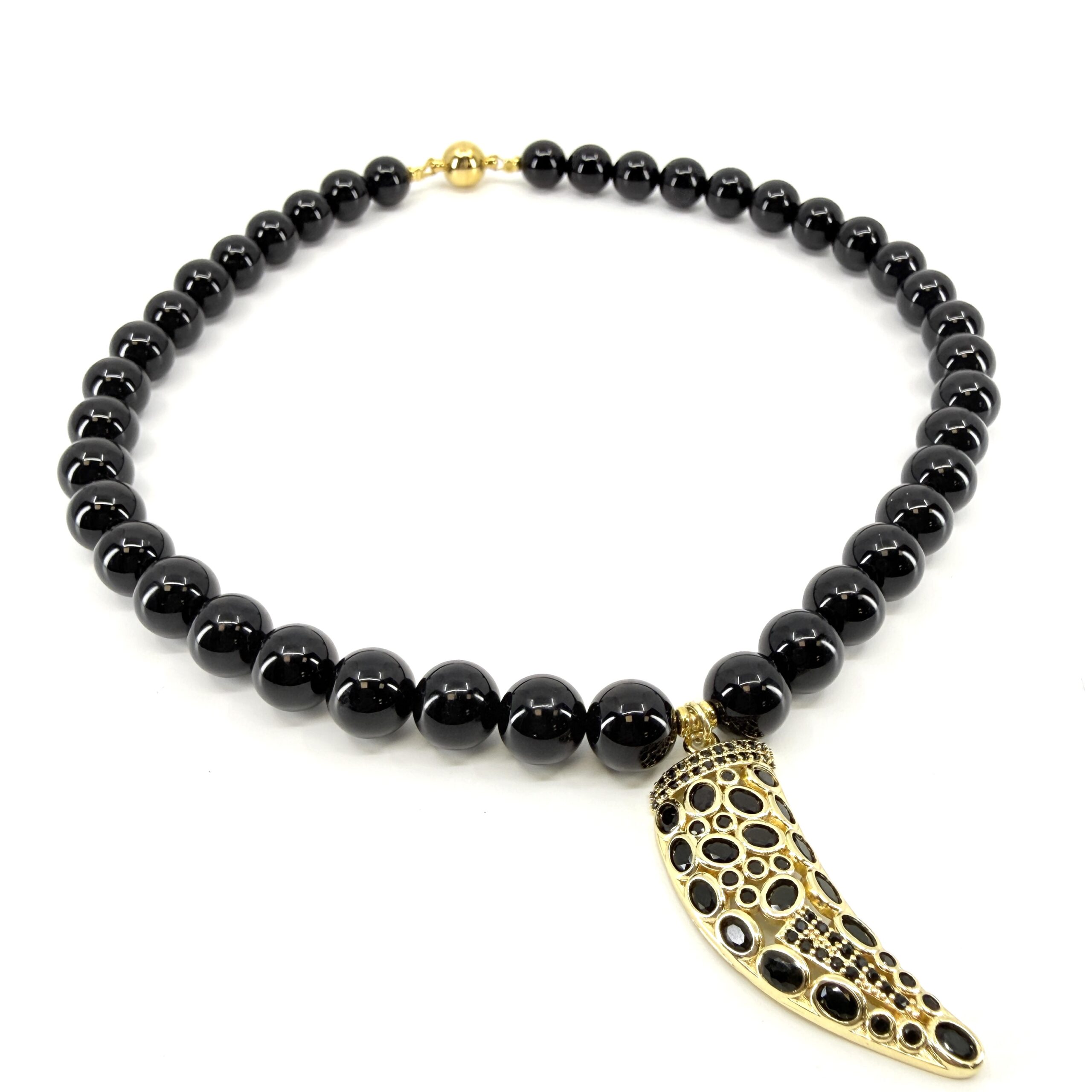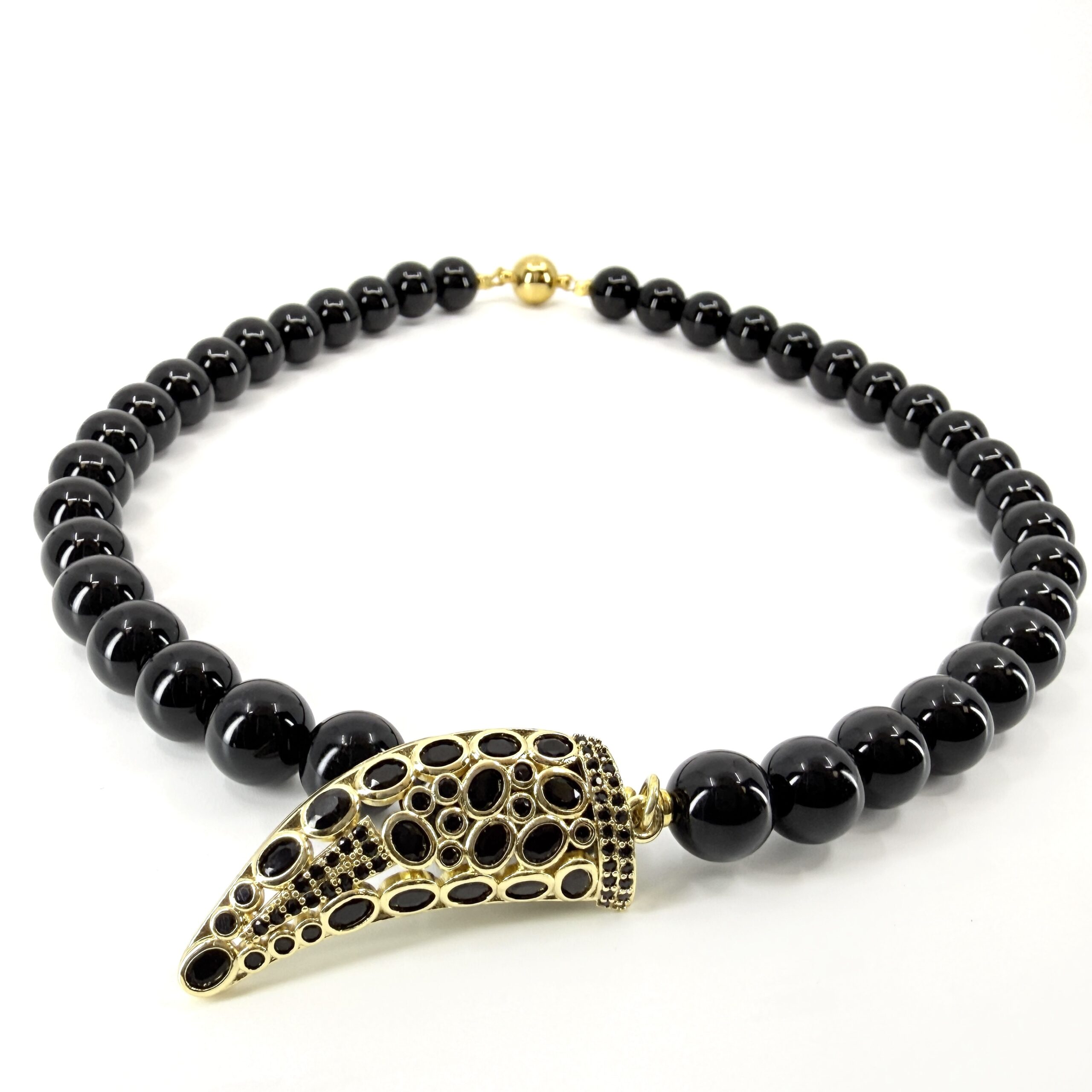 Elegantný náhrdelník z prírodného onyxu doplnený výnimočným príveskom v tvare rohu hojnosti vykladaným brúseným onyxom predstavuje spojenie symboliky, ochrany a nadčasovej elegancie.
