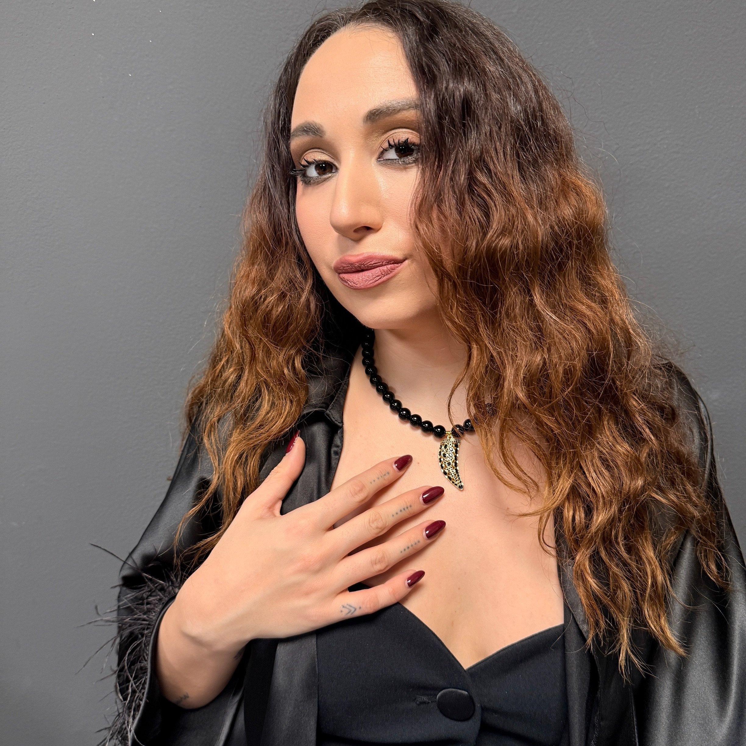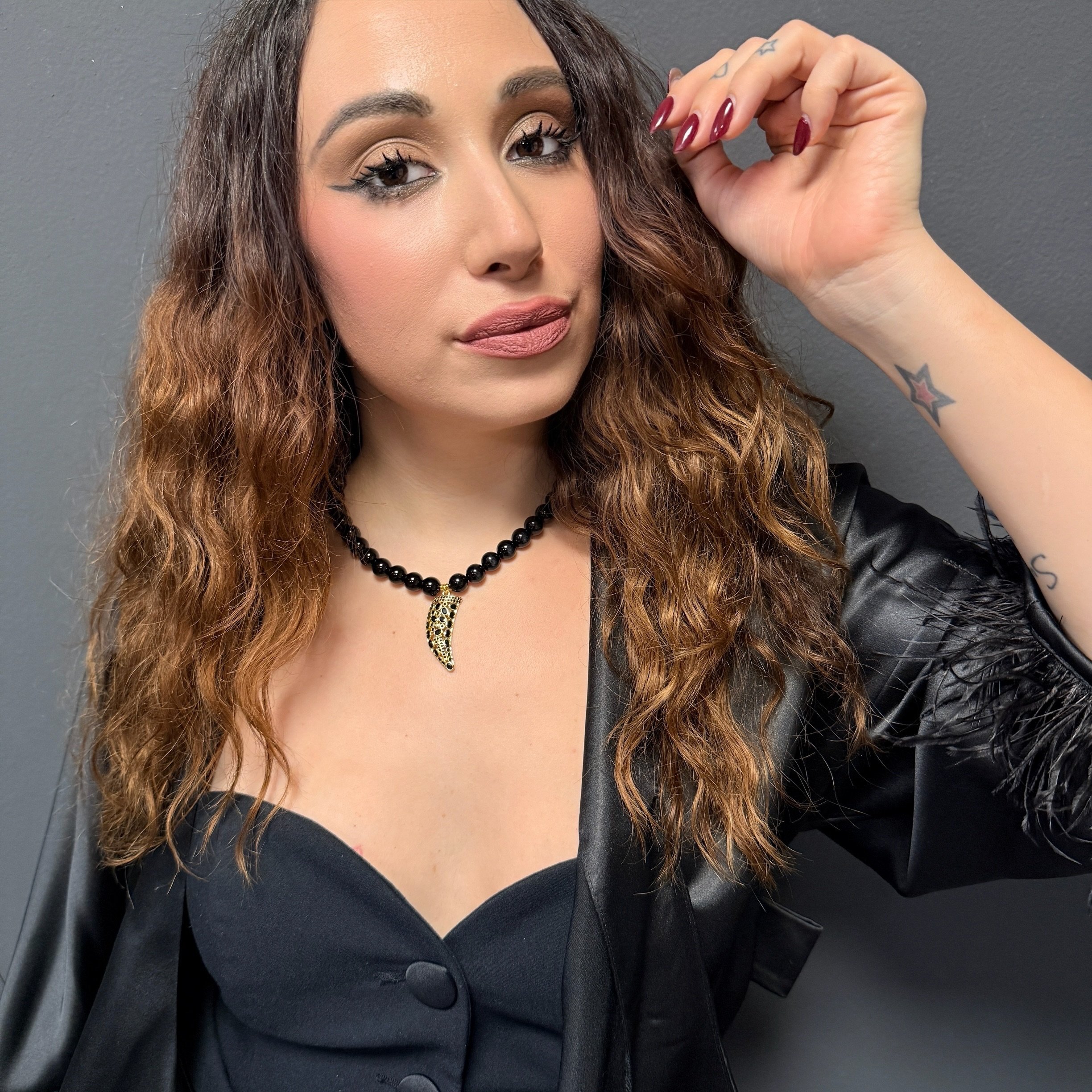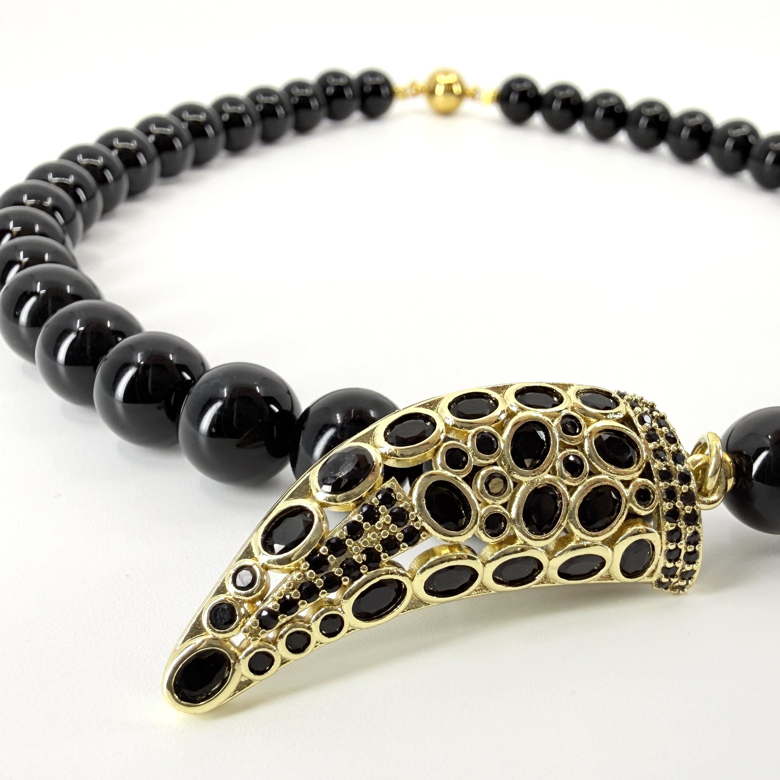 Elegantný náhrdelník z prírodného onyxu doplnený výnimočným príveskom v tvare rohu hojnosti vykladaným brúseným onyxom predstavuje spojenie symboliky, ochrany a nadčasovej elegancie.