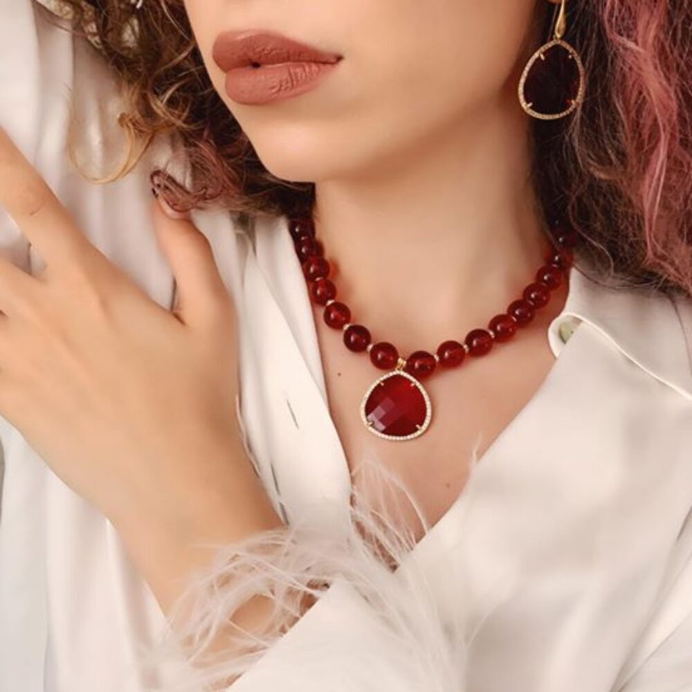 Kráľovské pohladenie, náhrdelník je tak honosný, že si zaslúži takéto pomenovanie… kombinácia krištáľu, prifarbeného do nádhernej červenej som doladila TOP brúseným príveskom, ktorý je bohato zdobený zirkónmi…obruba je pozlátená žltým 14-karátovým zlatom…