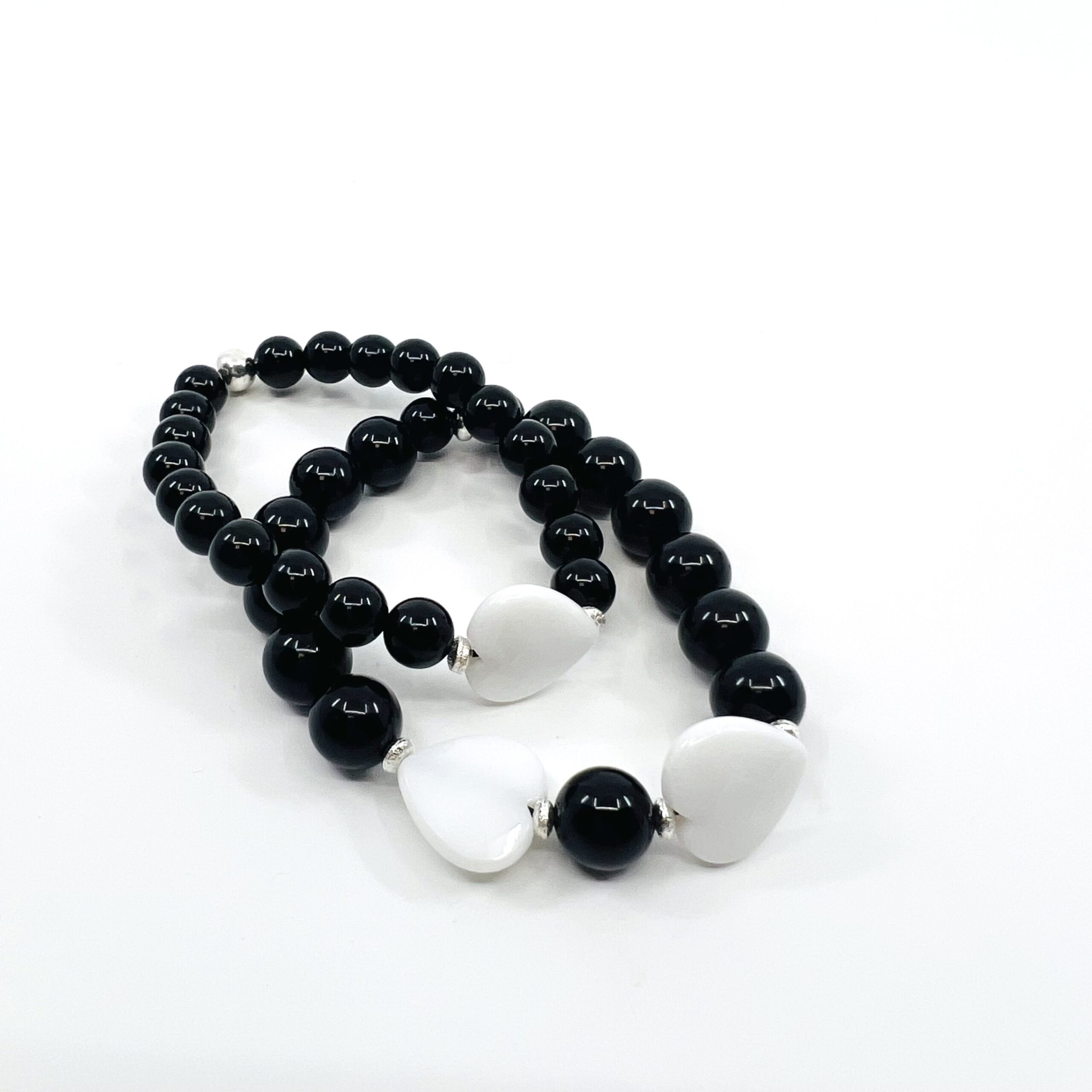 Black&white set náramok som vytvorila z onyxu, magnezitu, striebra, spolu s náušnicami a náhrdelníkom tvoria dokonalý set. Tento šperk nie je len ozdobou. Je to rituál ukrytý v materiáli, spojený z prvkov Zeme, ktoré spolu vytvárajú rovnováhu.