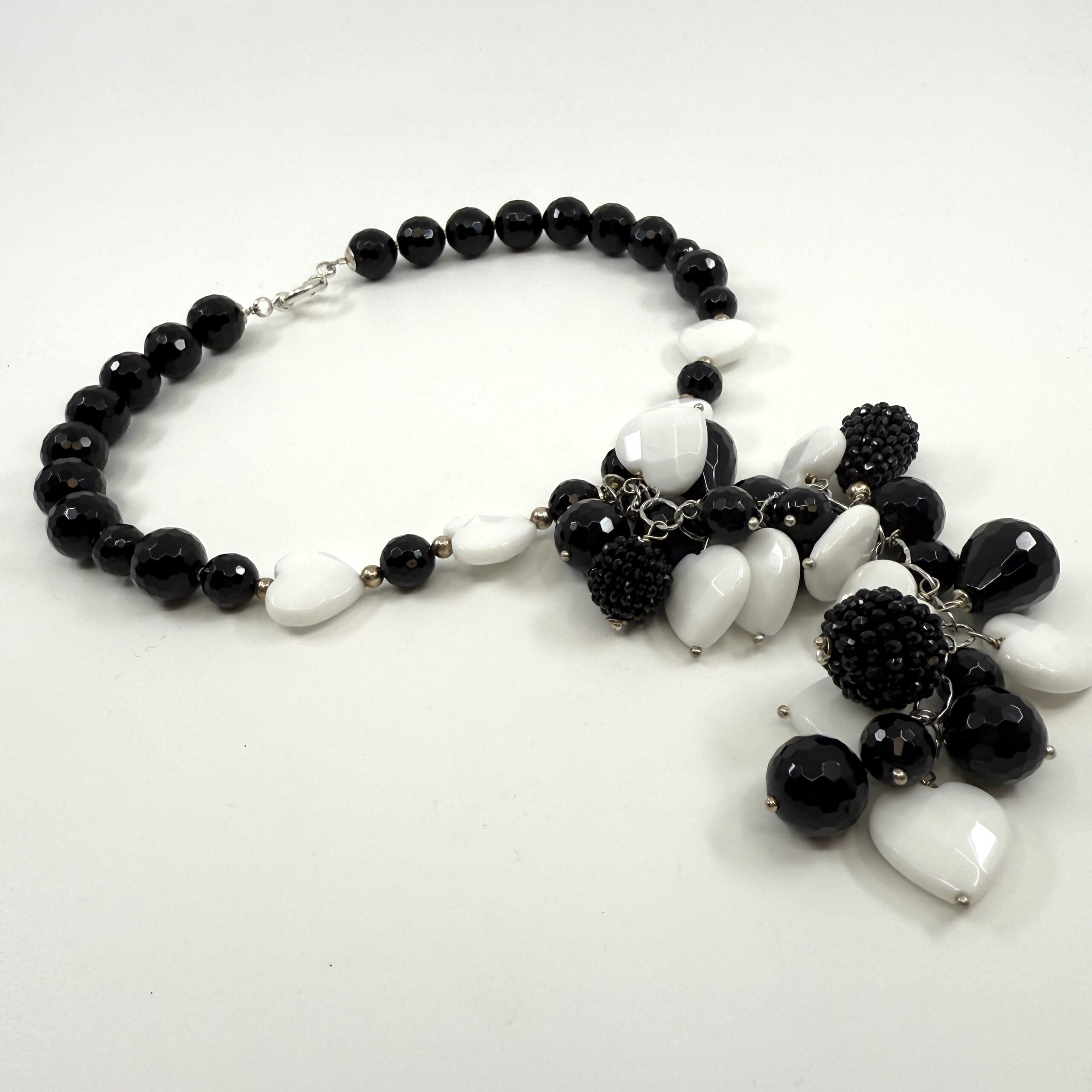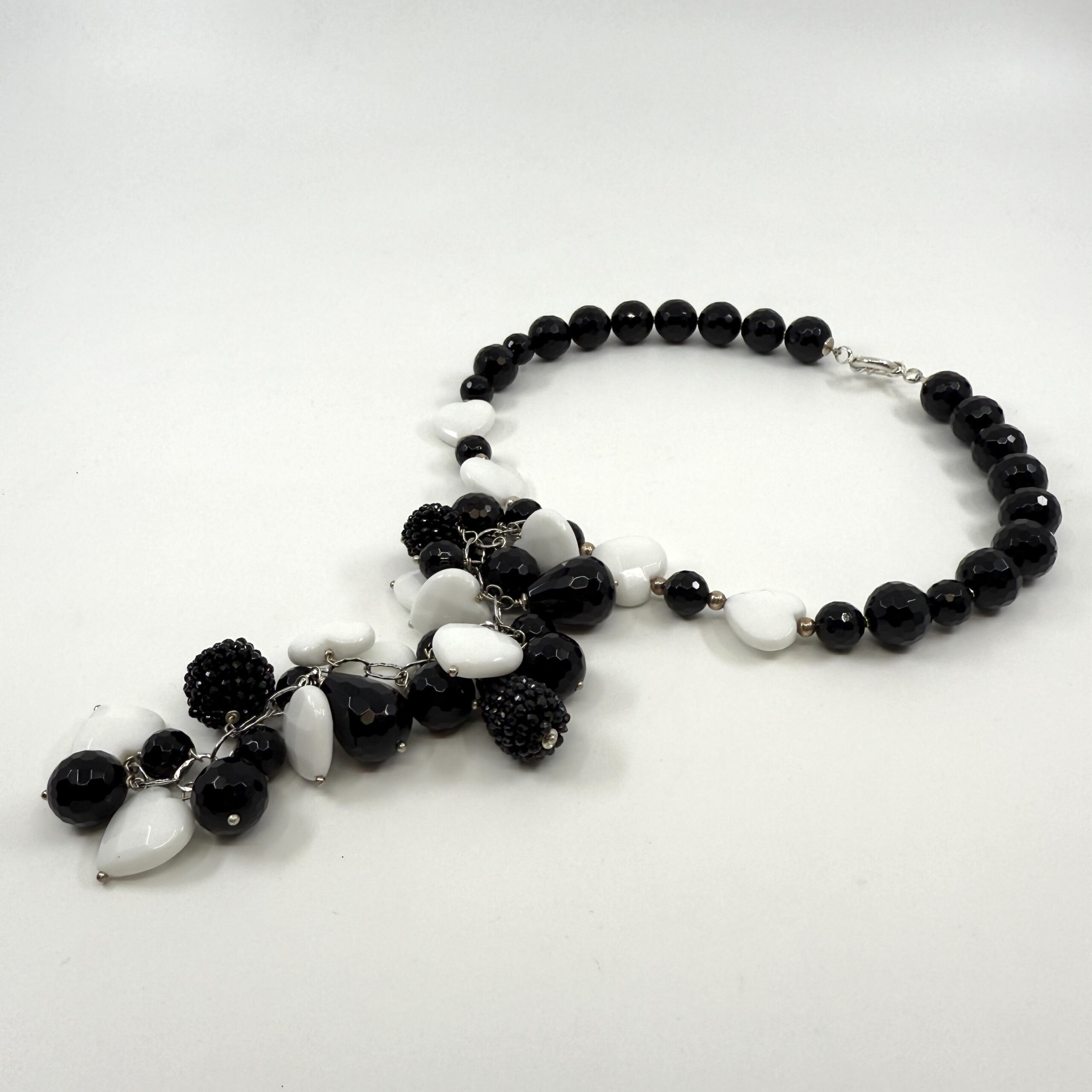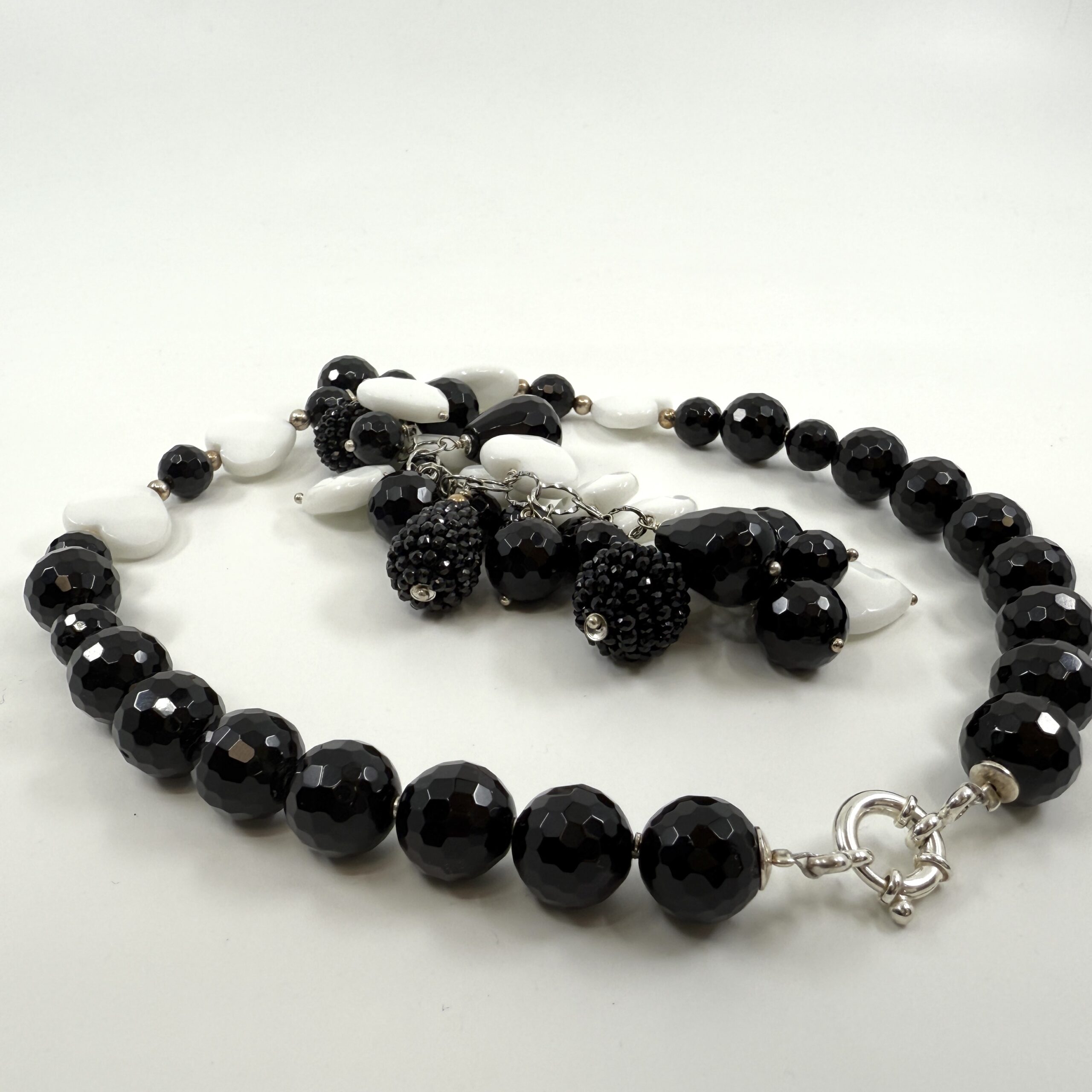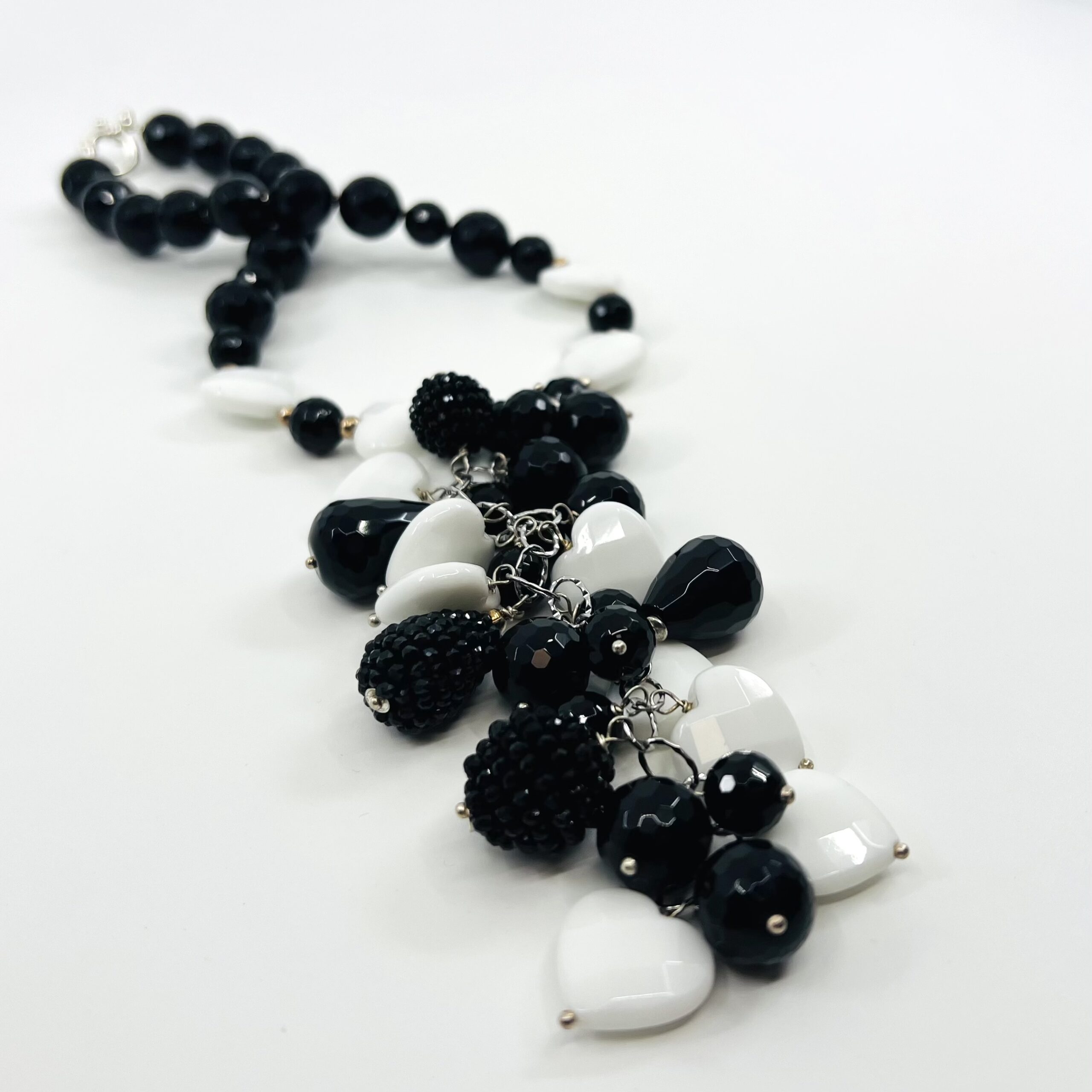 Black&white necklace som vytvorila z onyxu, magnezitu, striebra, spolu s náušnicami a náramkami tvoria dokonalý set. Tento šperk nie je len ozdobou. Je to rituál ukrytý v materiáli, spojený z prvkov Zeme, ktoré spolu vytvárajú rovnováhu.