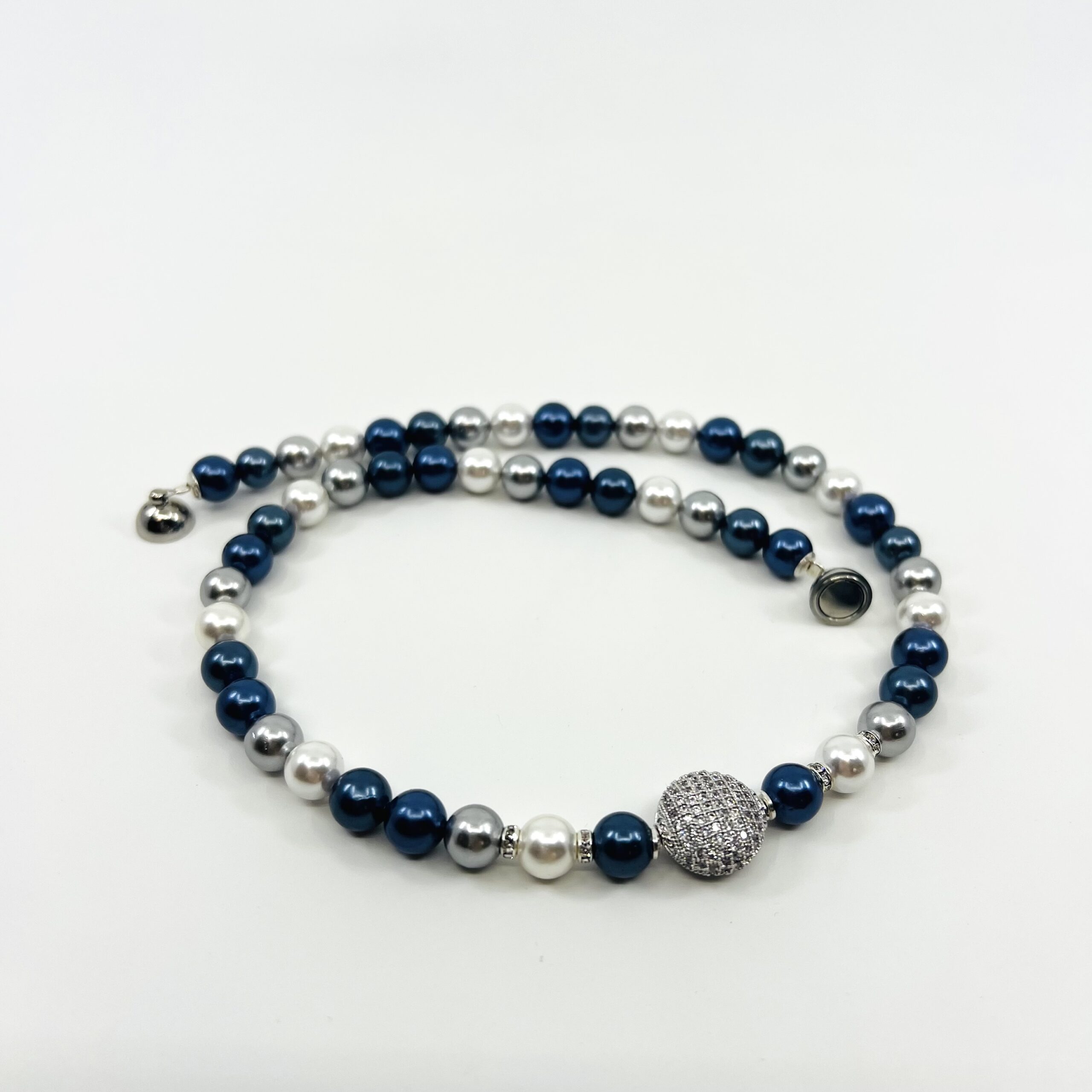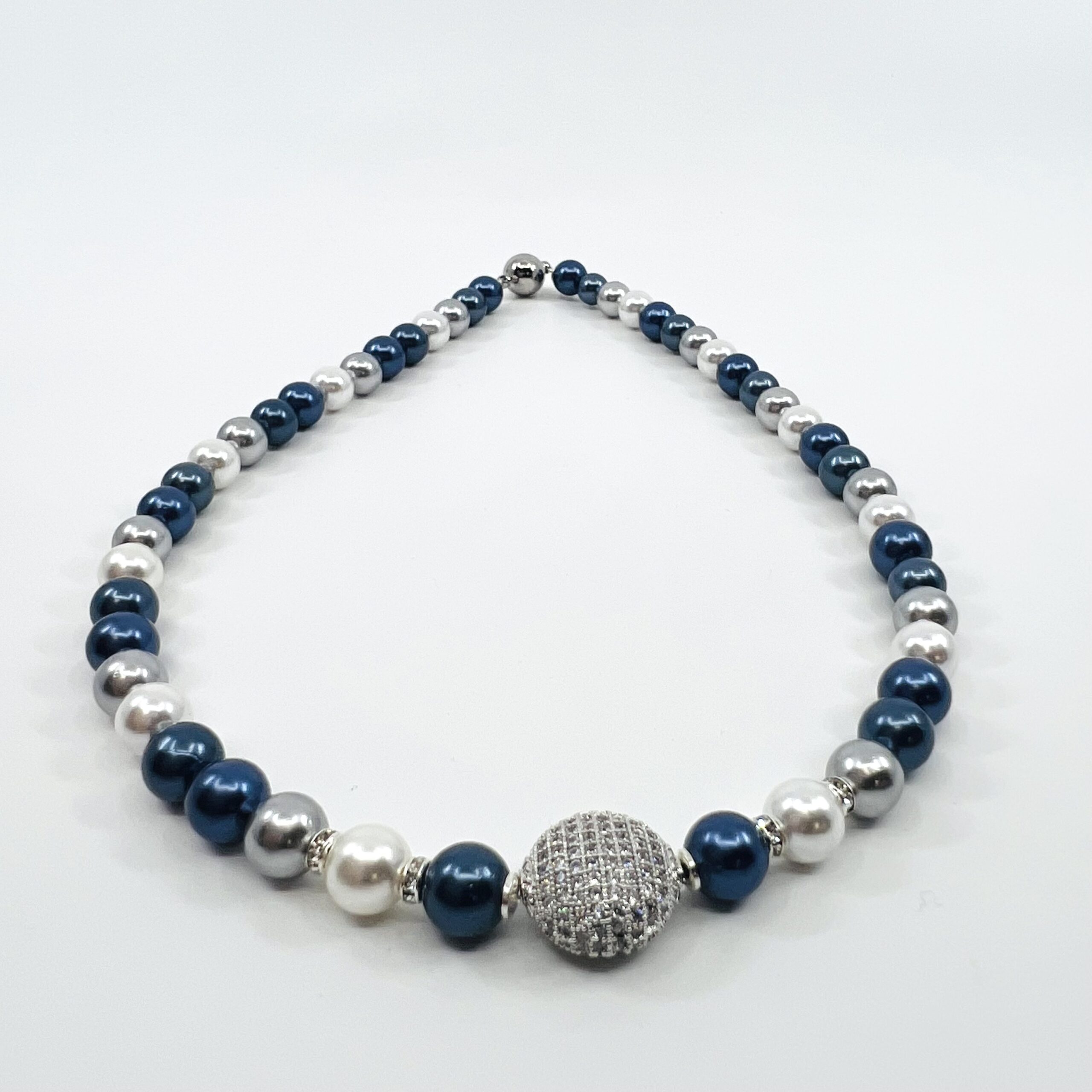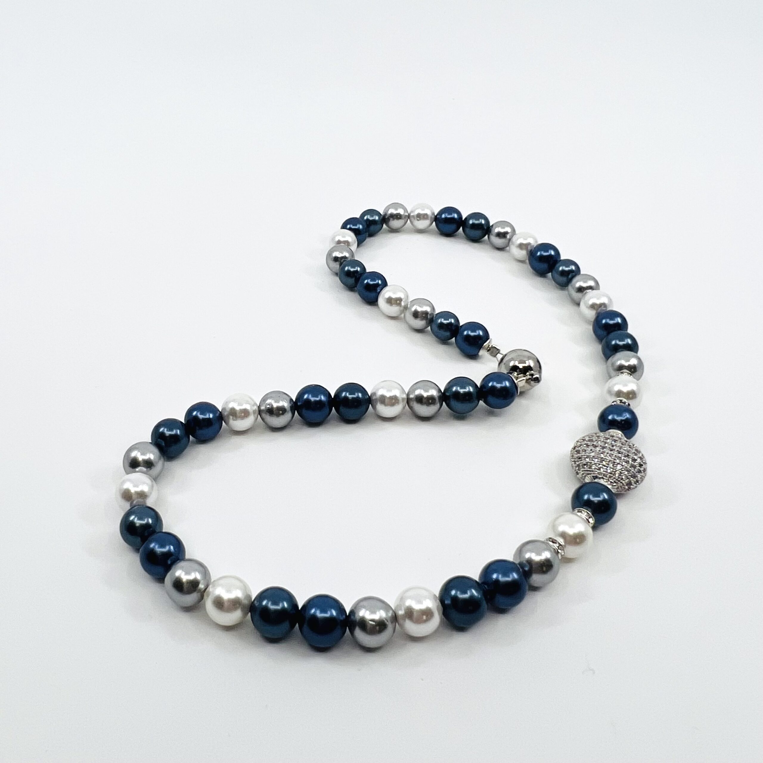 Blue sparkling moon náhrdelník v sebe spája eleganciu prírody a lesk moderného dizajnu. Dominantným prvkom sú Shell perly v troch harmonických odtieňoch – modrá, sivá a biela – ktoré symbolizujú pokoj, stabilitu a čistotu. Perly sú vytvorené z prírodného perleťového jadra, ktoré je upravené tak, aby si zachovalo krásny lesk a dokonalý tvar.