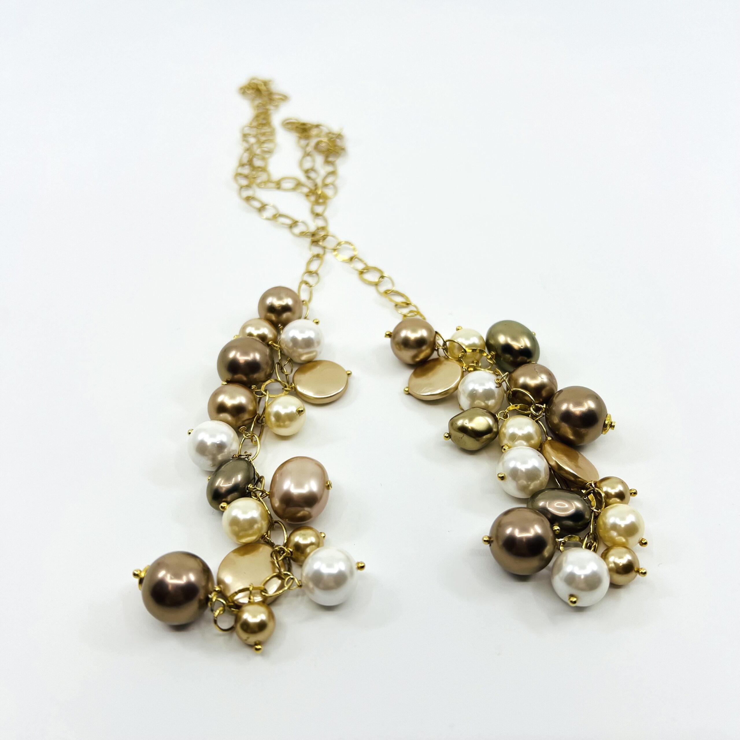 Golden&Brown shell pearls Tento výnimočný náhrdelník som vytvorila zo shell perál rôznych tvarov a veľkostí, ktoré sa spájajú do harmonickej palety zemitých odtieňov – od teplej béžovej až po čistú bielu. Perly sú vkomponované do jemnej retiazky zo striebra pozláteného 14-karátovým zlatom, čo šperku dodáva luxusný, no stále prirodzený vzhľad. Ide o môj obľúbený „šalový“ typ náhrdelníka – jednoducho sa previaže podľa nálady alebo outfitu. Môžete ho nosiť dlhý, previazaný, alebo ako viacvrstvový šperk. Vždy vyzerá originálne. Jemný detail, ktorý z vás urobí výnimočnú – s dotykom prírody a noblesy.