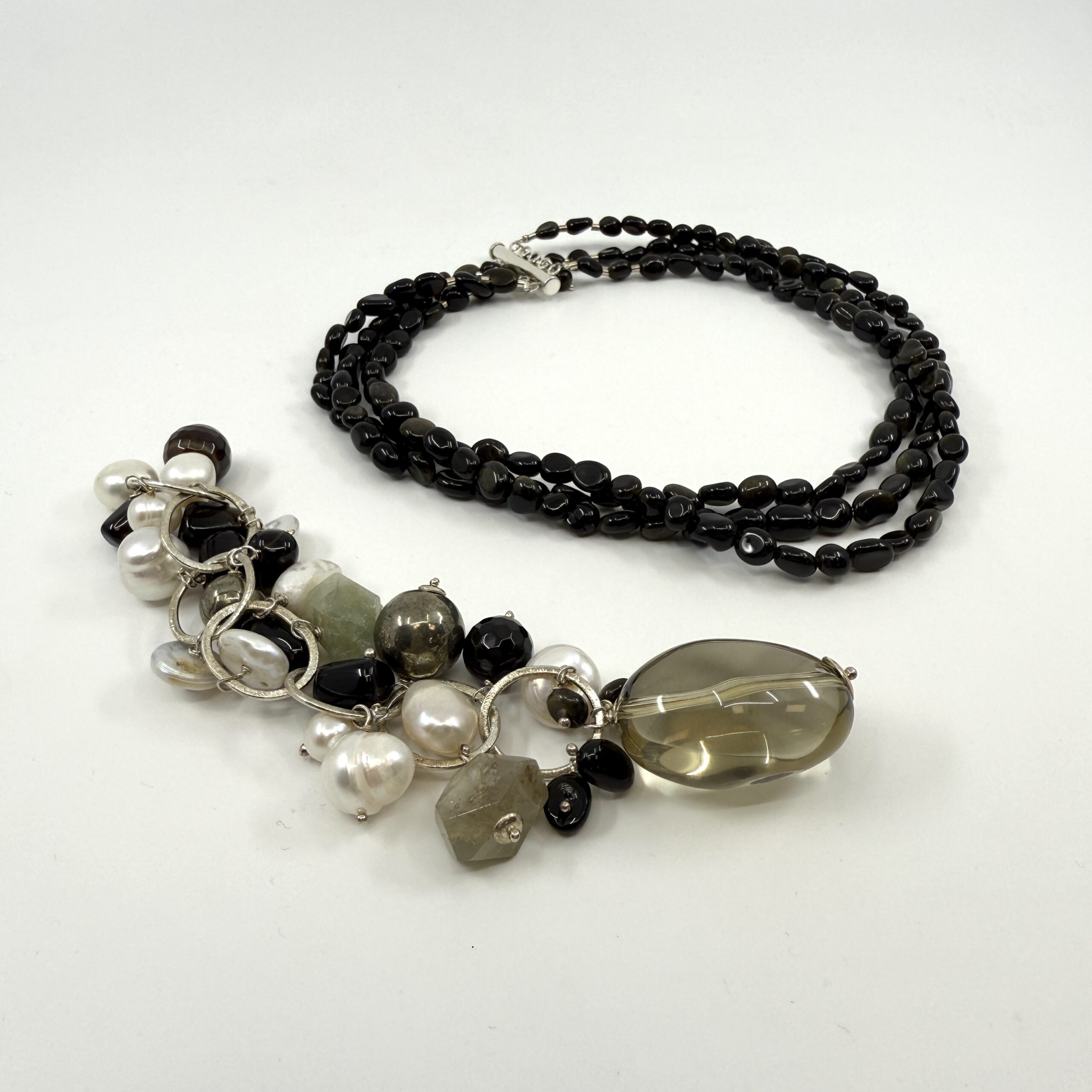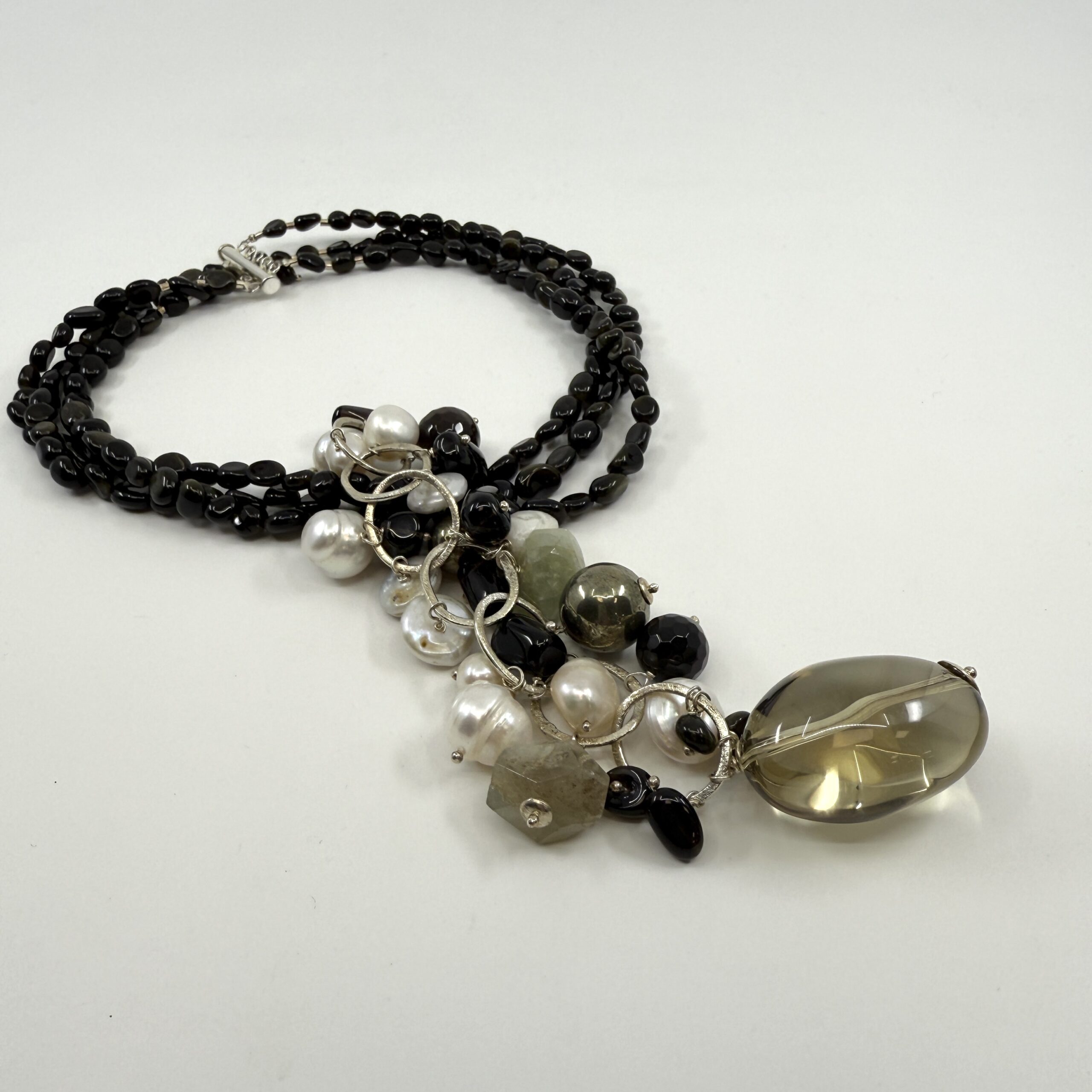 Woody vibes som vytvorila 3-radový náhrdelník zo záhnedy, prírodného minerálu s hlbokým, uzemňujúcim odtieňom. Každý rad nesie inú textúru a energiu od nepravidelnej brúšenej záhnedy, cez elegantné perly až po lesklý pyrit. Dominantou šperku je bohato zdobený strapec, ktorý visí ako výrazný detail z veľkej, leštenej záhnedy – unikátneho kameňa, ktorý zaujme hneď na prvý pohľad. Náhrdelník ponúka variabilitu nosenia – môžete ho nosiť ako jeden výrazný šperk so strapcom, alebo ho jednoducho premeniť na elegantný trojrad bez strapca. Ideálny pre ženy, ktoré milujú prírodu, symboliku minerálov a vyhľadávajú jedinečné, zberateľské kúsky.